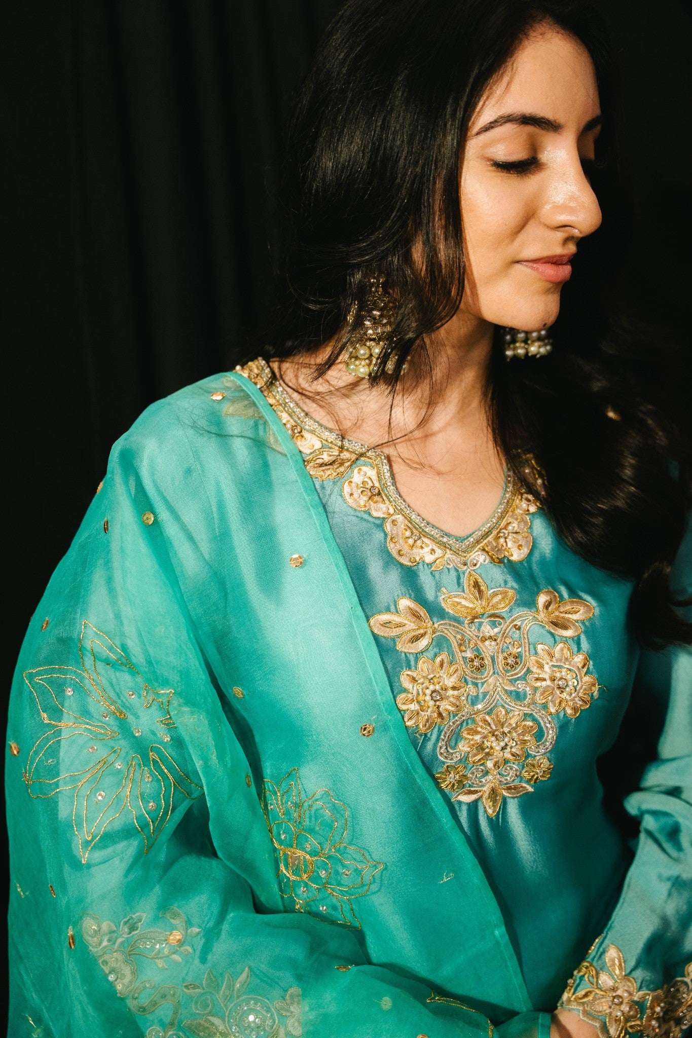 A stunning ensemble featuring intricate pearl dabka and sequin embroidery in elegant floral motifs. The neckline and sleeves are beautifully detailed with gold thread and beadwork, adding richness and charm to the look. Paired with a soft organza dupatta, delicately embroidered with floral outlines and subtle sequins, this outfit strikes the perfect balance between traditional elegance and contemporary grace