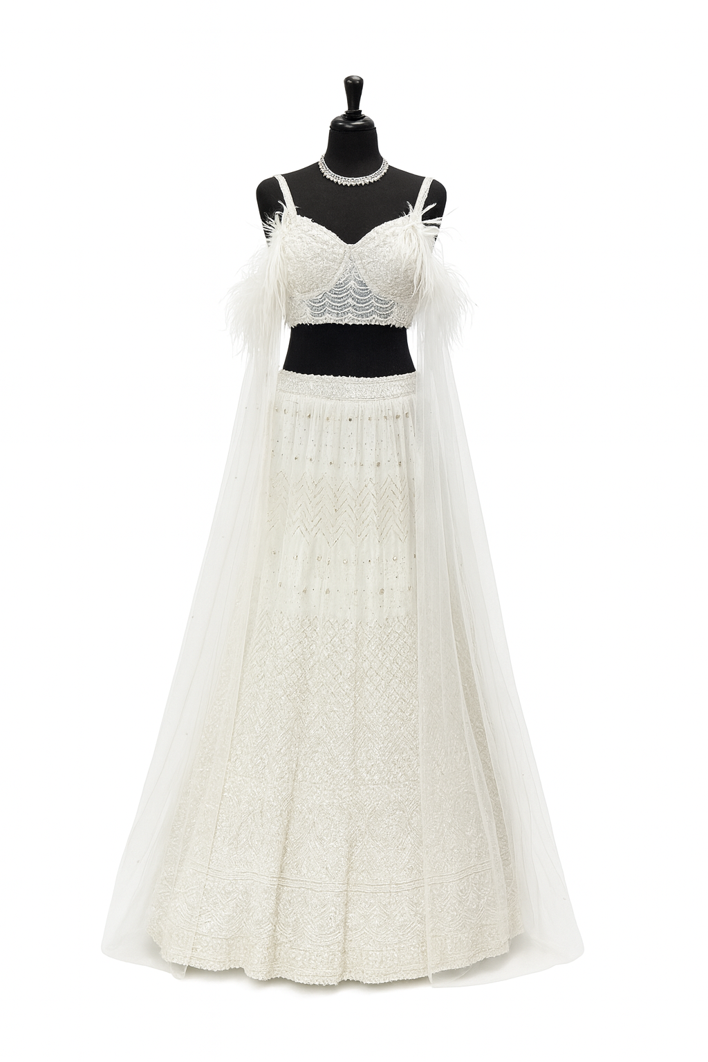 Grace and glamour come together in this exquisite lehenga, adorned with intricate pearl and thread work. The delicate fur detailing on the sleeves adds a touch of luxury, making it a perfect choice for those who love a blend of elegance and drama.