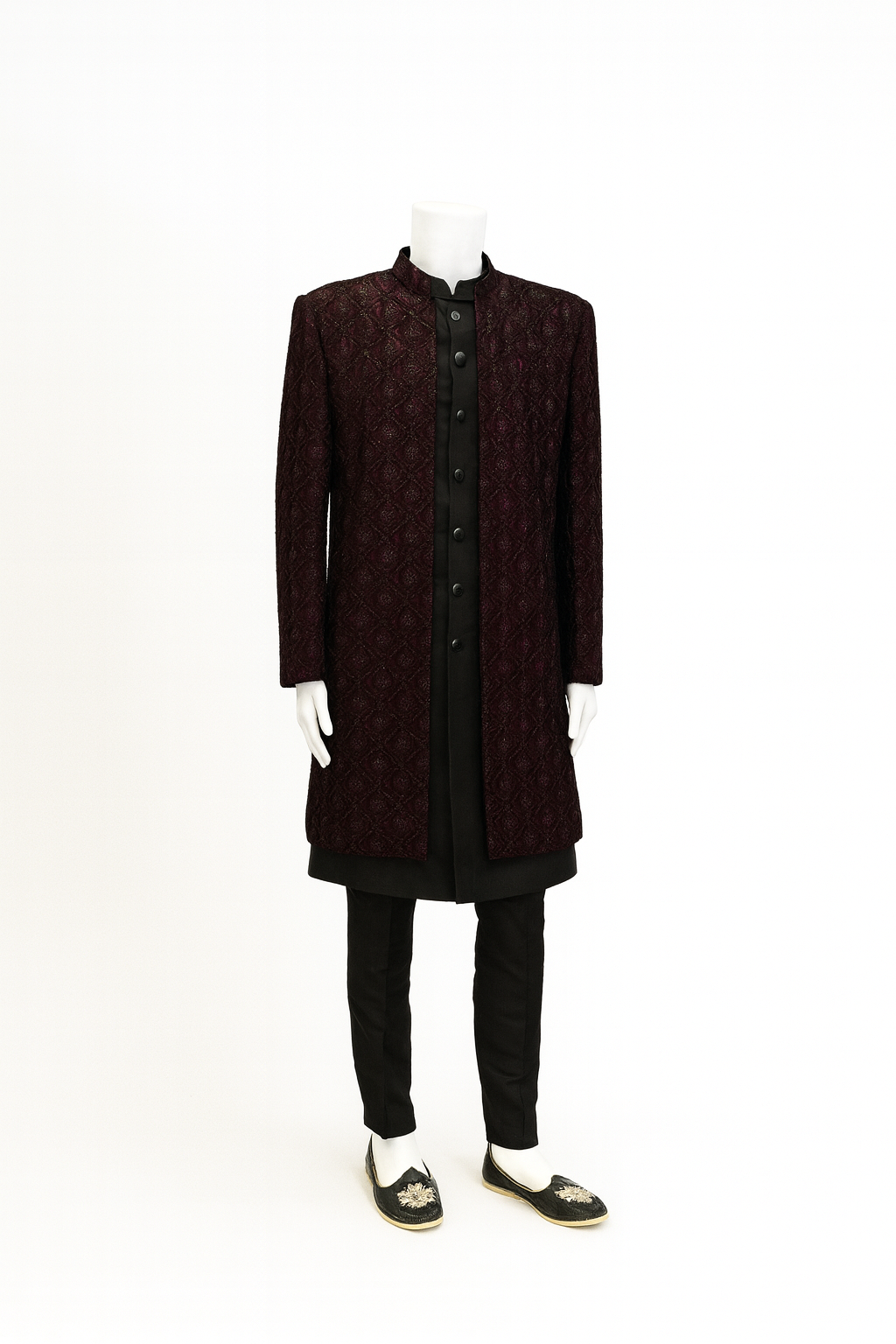 Where tradition meets artistry — a regal purple sherwani adorned with exquisite handwork, crafted to perfection for the modern royal.
