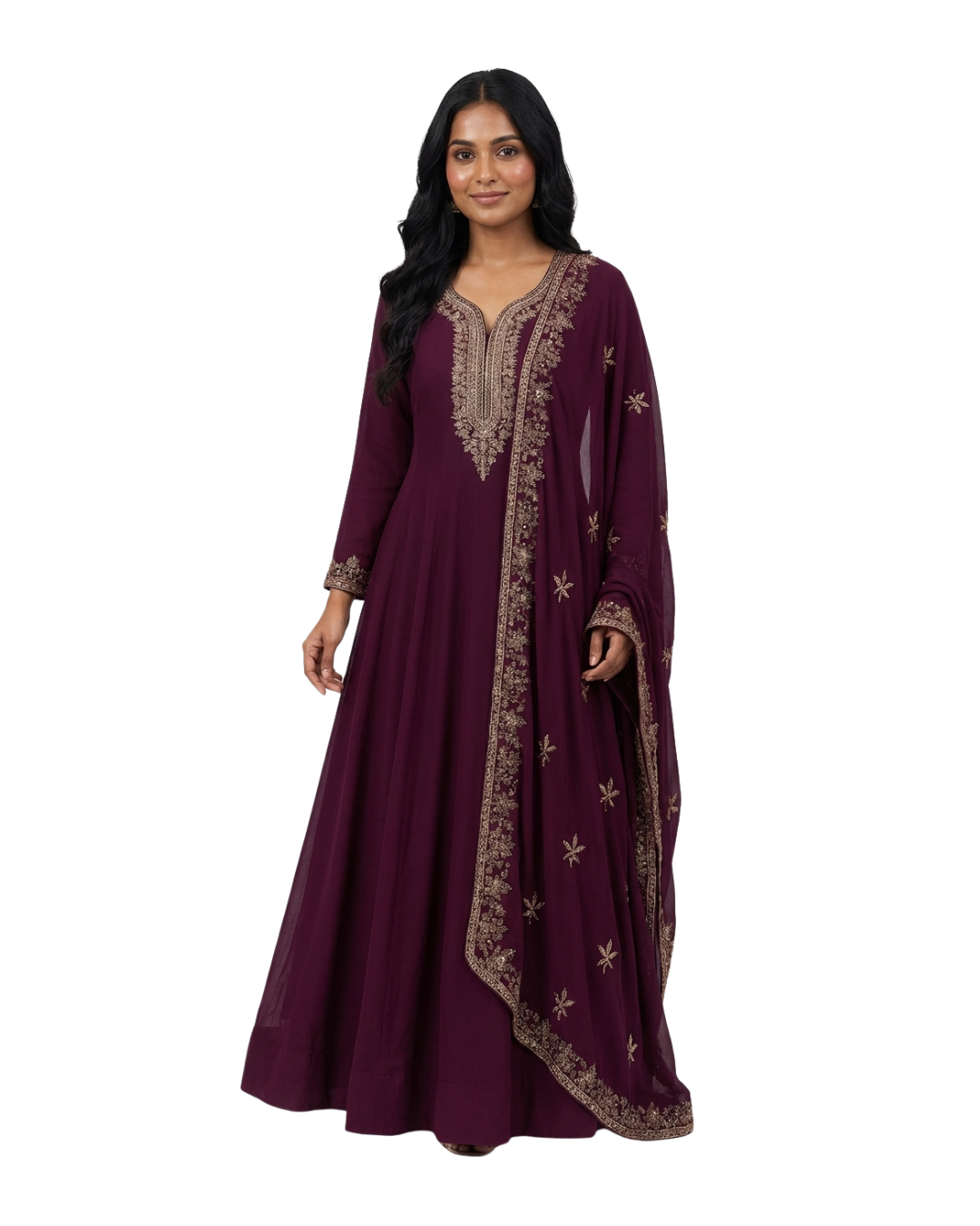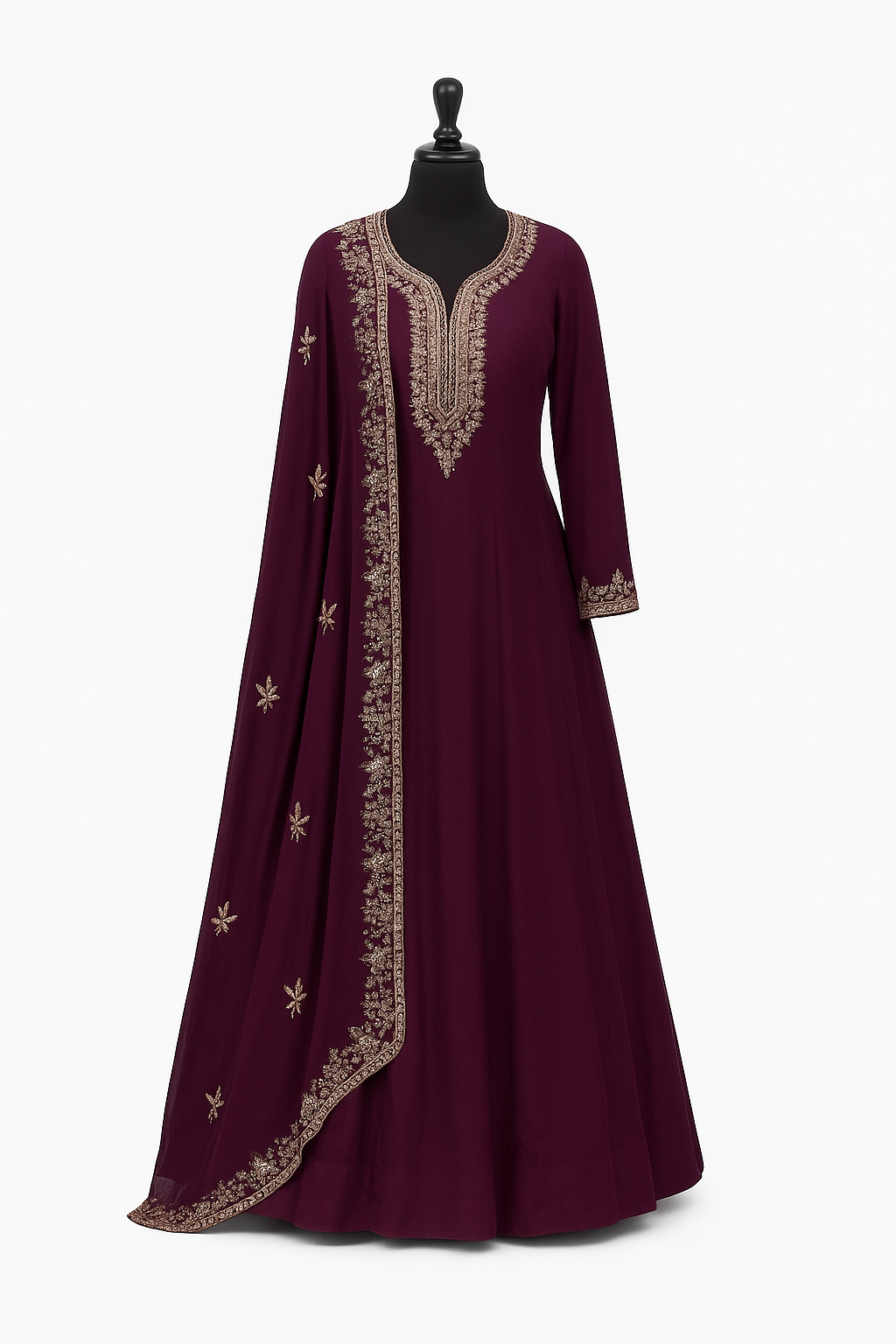 Make a statement in our wine-colored suit, adorned with sparkling sequins work. Paired with a heavy, richly detailed dupatta, this ensemble is perfect for adding a touch of glamour to any special occasion.