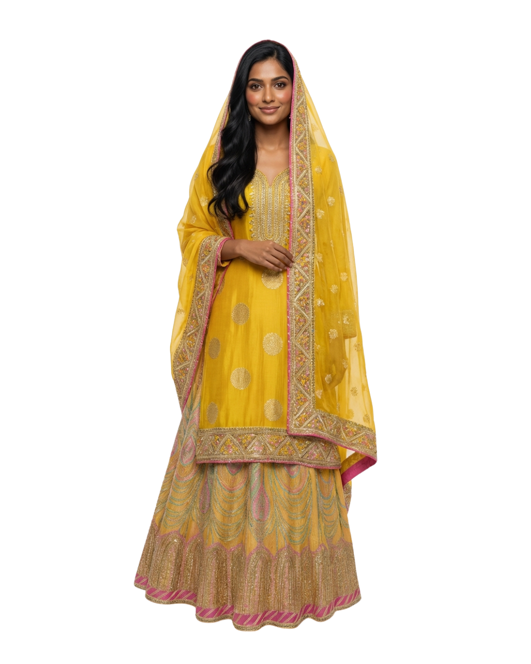 Brighten up your wardrobe with this yellow semi-stitched suit, featuring a beautifully embroidered skirt and a heavy dupatta. Ideal for festive occasions, it combines vibrant color with elegant detailing for a standout look.